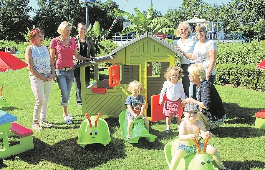 Wippende Raupen und Krokodile, bunte Häuschen mit Türklingeln und Sitzgruppen mit Sonnenschirm eigens für Steppkes: Die Mädchen und Jungen, die am Mittwoch mit ihren Eltern ins Frei- und Wellenbad Heiden kamen, steuerten meistens schnurstracks auf die neuen Spielgeräte auf der Liegewiese zu. Petra Jokiel und ihr Team von der Aktion „Gänseblümchen“ freute es. Zeigte die Begeisterung doch, dass sie ihre Spende von 1.000 Euro „richtig angelegt“ hatten.
