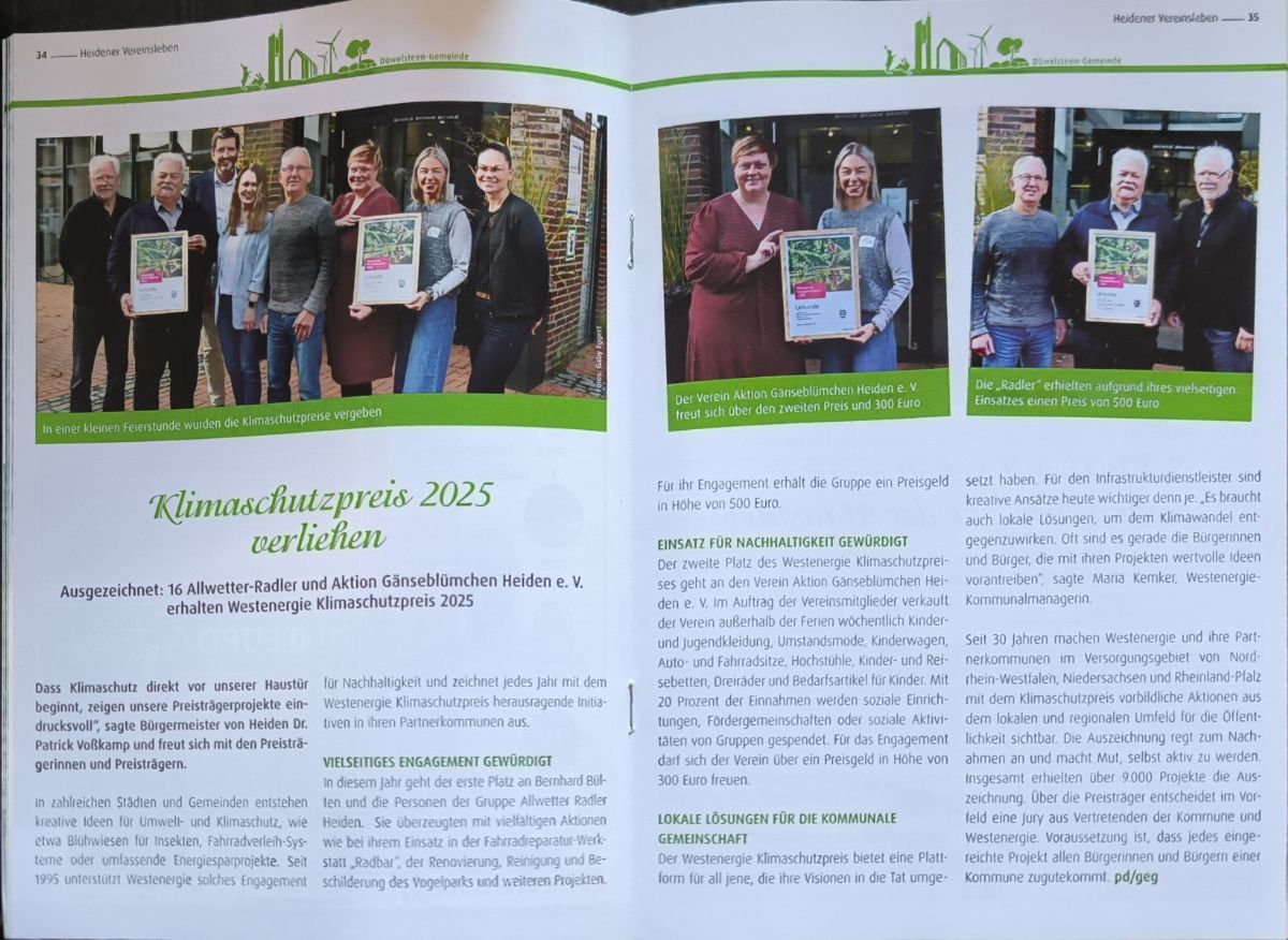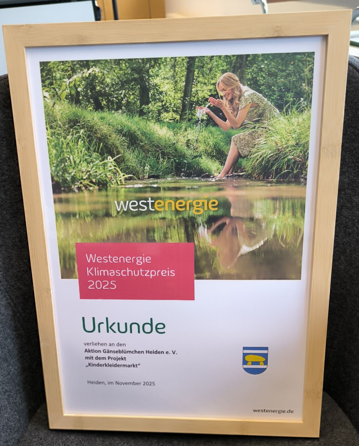 Wir als Aktion Gänseblümchen Heiden e.V. bedanken uns bei der Jury für die Auswahl unseres Vereins für diesen Preis. Das Preisgeld von 300€ werden wir in die Spenden mit einfließen lassen. Dieses Jahr werden unsere Spenden im Gießkannenprinzip an die Heidener Vereine mit Kinder-& Jungendabteilungen verteilt.
