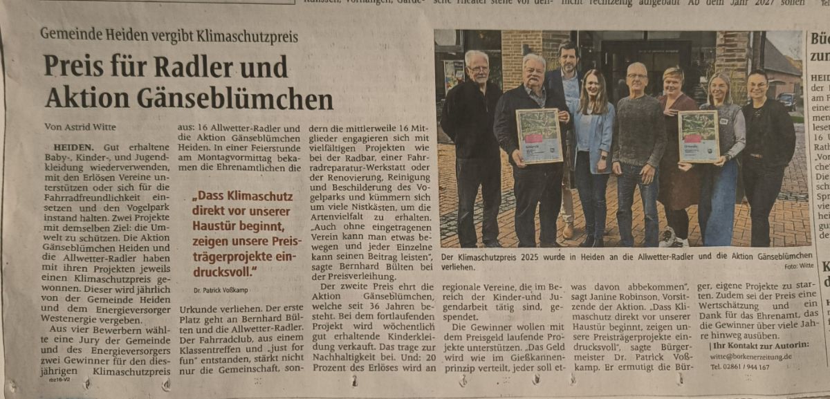 "Das Klimaschutz direkt vor unserer Haustür beginnt, zeigen unsere Preisträgerprojekte eindrucksvoll", sagte Bürgermeister von Heiden Dr. Patrick Voßkamp und freut sich mit den Preisträgerinnen und Preisträgern.