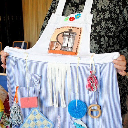 HEIDEN. Auf den ersten Blick sieht die Schürze, an der ein gehäkelter Topflappen, ein Schwamm, ein Einkochring und andere Küchenutensilien baumeln, schon etwas lustig aus. Doch die Schürze, die Elke…