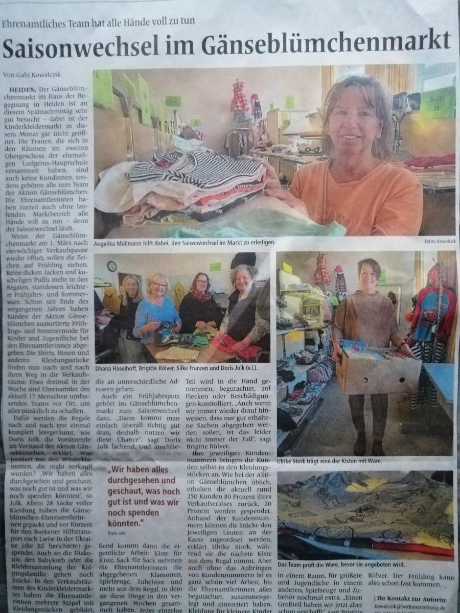 Heiden – Der Gänseblümchenmarkt im Haus der Begegnung in Heiden ist an diesem Tag sehr gut besucht – dabei ist der Kleidermarkt in diesem Monat gar nicht geöffnet. Die Frauen, dich sich in den Räumen im zweiten Obergeschoss der ehemaligen Hauptschule versammelt haben, sind auch keine Kundinnen, sondern gehören alle zum Team der Aktion Gänseblümchen. Die Ehrenamtlerinnen haben zur Zeit auch ohne laufenden Marktbetrieb alle Hände voll zu tun – denn der Saisonwechsel läuft. Wenn der Gänseblümchenmarkt am 01. März wieder öffnet, sollen die Zeichen auf Frühling stehen …