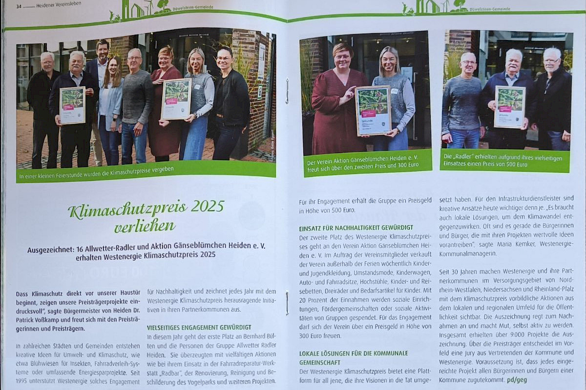 Wir als Aktion Gänseblümchen Heiden e.V. bedanken uns bei der Jury für die Auswahl unseres Vereins für diesen Preis. Das Preisgeld von 300€ werden wir in die Spenden mit einfließen lassen. Dieses Jahr werden unsere Spenden im Gießkannenprinzip an die Heidener Vereine mit Kinder-& Jungendabteilungen verteilt.