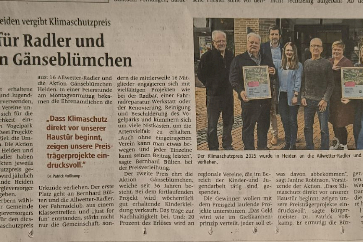 "Das Klimaschutz direkt vor unserer Haustür beginnt, zeigen unsere Preisträgerprojekte eindrucksvoll", sagte Bürgermeister von Heiden Dr. Patrick Voßkamp und freut sich mit den Preisträgerinnen und Preisträgern.